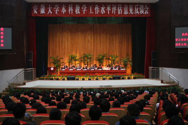 李延保组长代表专家组反馈了专家组实地考察意见。他说,受教育部的委派,专家组一行13人,于11月4日至9日,对安徽大学本科教学工作水平进行评估。专家们在校考察期间,听取了校长的工作汇报,审阅了自评报告,观看了专题片,考察了公共教学设施,走访了21个教学单位和12个职能部门,抽查了26门课程的1882份试卷和27个专业的725份毕业论文(毕业设计),对150名学生进行了技能测试,召开了校领导座谈会、原校领导座谈会、中青年骨干教师座谈会、青年教师座谈会、教学管理干部座谈会、有关院(系)分管学生工作的副书记和辅导员座谈会、学生座谈会。