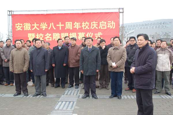 黄德宽说,2008年,安徽大学将迎来八十周年校庆,这是安徽大学发展史上的重要里程碑,是学校走向未来的新起点。届时将邀约各界宾朋、海内外校友欢聚校园,话情谊,谋发展,共庆八十华诞。作为校庆献礼活动的重要内容之一,学校在磬苑校区南门广场建成了校名雕塑,这将成为校园一处重要的人文景观,对于提升校园精神文化品质,鼓舞全校师生励精图治,继往开来有着十分重要的意义。今天我们举行校名雕塑揭幕活动,标志着建校八十周年校庆活动的正式启动,此后学校将以“继承办学传统、总结办学成就、增进校友情谊、共商发展大计”为宗旨,举办系列庆典活动,进一步激发全校师生员工和广大校友爱校、兴校热情,凝心聚力,全面推进高水平大学建设。