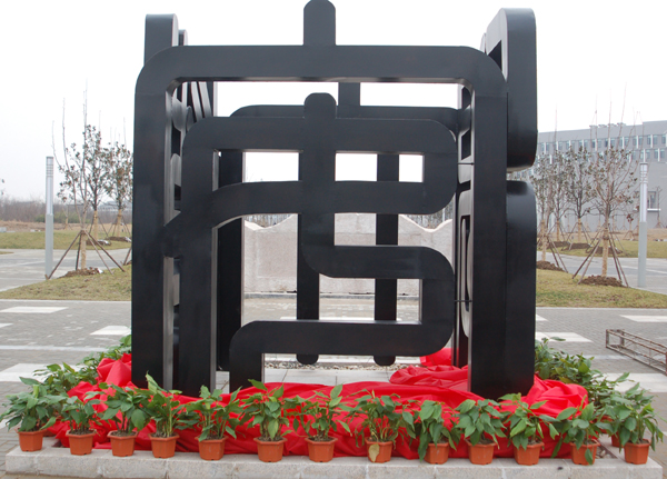 校名雕塑为篆体“安徽大学”四字,由钢板仿铸铁制作,每个字的规格为2.6米×3.0米。