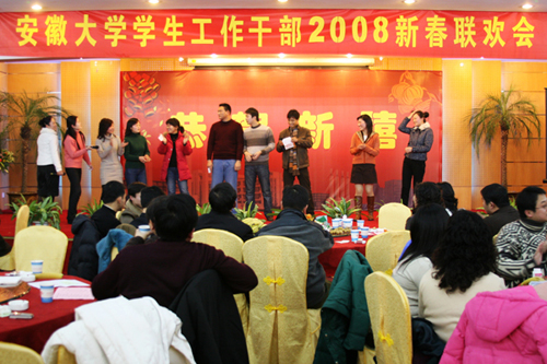 1月22日晚,学校在金环酒店举行学生工作干部2008新春联欢会。校长黄德宽,校党委副书记叶华,副校长杜先能出席了联欢会。黄德宽高度评价了我校团学干部2007年的工作成绩,并对2008年的学生工作提出了要求。各院系分管学生工作的副书记、团干、专兼职辅导员共 161人参加了联欢会。部分团学干部表演了精彩节目。