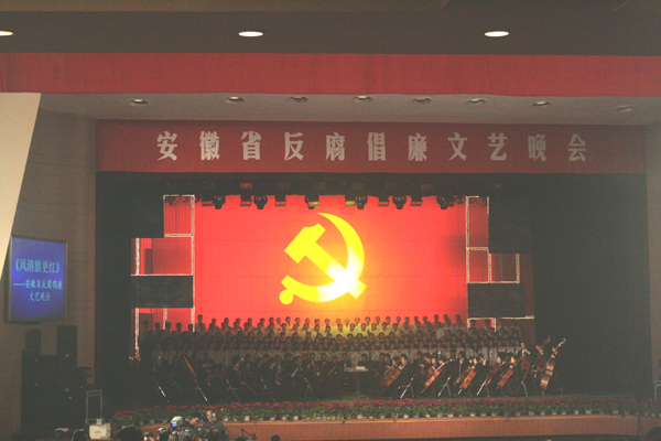 “立党为公,执政为民,让鲜红的党旗在共和国的上空高高飘扬……”3月26日晚,安徽大剧院内华灯绽放,歌声飞扬,由省纪委、省委组织部、省委宣传部主办的“风清旗更红”反腐倡廉文艺晚会在这里隆重举行。我校领导陆勤毅、杨家芹及有关单位负责人观看了演出。