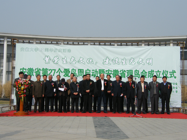 之后,顾长明宣布安徽省动物学会观鸟分会成立。汤坚和王群京共同为新筹建的观鸟会揭牌。汤坚并宣布安徽省第27个爱鸟周确定为4月5日至11日,同时向社会正式公布合肥市市鸟为喜鹊。观鸟分会会长、我校江淮学院梁君发言,希望广大市民加入到爱鸟护鸟队伍中来。