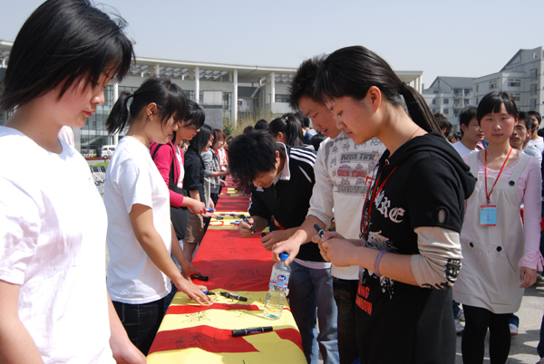 4月26日至27日,“迎奥运,庆校庆”签名活动在鸣磬广场隆重举行。我校师生纷纷在象征学校80华诞的80米横幅上抒写挚爱深情和美好祝福。
