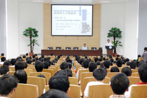 5月8日下午,上海中科合臣股份有限公司董事长黄山应邀在磬苑校区博学北楼d101作题为《市场对人才的需求》的报告。报告会由校党委书记陆勤毅主持。来自全校各院系的500余名师生聆听了报告。黄山在报告中结合上海中科合臣股份有限公司的实际,分析了当前人才市场的供需矛盾。他建议同学们更新就业观念,从德才两个方面努力提升自我,积极参与社会公益活动,培养责任感,为未来就业做准备。报告结束后,黄山还就如何签订劳动合同、怎么看待“跳槽热”等同学们提出的问题作了回答。