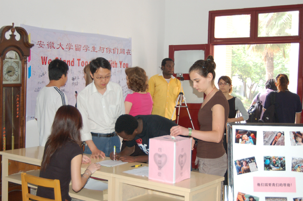 上午9点半,留学生志愿者在学院大厅内挂起了题为“安徽大学留学生与你们同在”的横幅并摆放了自制的“爱心”募捐箱。课间休息时,同学们纷纷拿起笔在横幅上签下自己的姓名和慰问的话语,并为灾区人民捐款,表达爱心。
