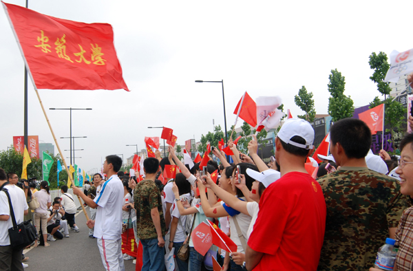8时35分,奥运圣火传递的车队出现在观众视线中。车上的火炬手频频向人群挥手致意,现场掌声如潮,欢呼声此起彼伏。我校师生挥舞着手中的国旗和五环旗,高喊“北京加油”“奥运加油”的口号,共同表达着见证奥运圣火传递的激动心情、对北京奥运和伟大祖国的美好祝愿。一些同学还手系黄丝带,为奥运加油,为灾区祈福。