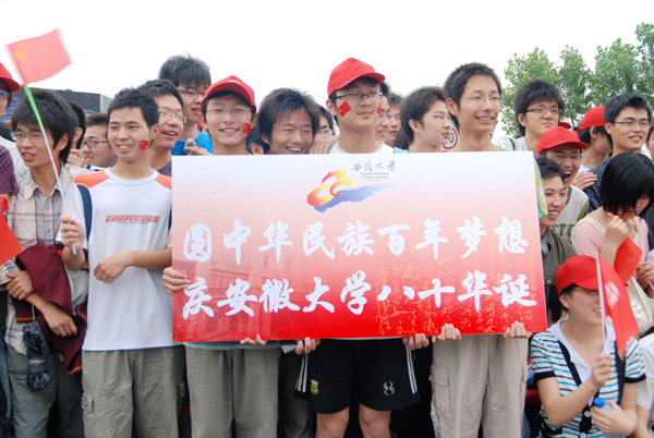 早晨5时30分,参加此次观看活动的同学即在院系和有关部门组织下按方阵集结完毕,从鸣磬广场出发。打头的同学举着国旗、北京奥运会会旗和校旗,4人一排的队伍绵延一公里许,“圆中华民族百年梦想,庆安徽大学八十华诞”“处处彰显文明,时时坚守希望”等标牌穿插其间,整齐行进在宽阔大路上,场面蔚为壮观。一小时后,队伍到达指定观看地点、与先期抵达的志愿者同学会合。