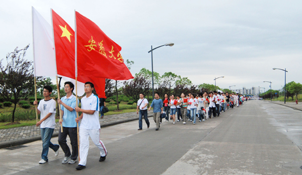 据了解,合肥的火炬传递活动从安徽国际会展中心出发,终点为合肥市体育中心,传递路线全长10.8公里,共有222名火炬手参加了传递活动。我校中文系葛倦同学、历史系胡井兵同学、哲学系研究生蒋伟同学还有幸担任了奥运火炬的护跑手。学校对组织观看火炬接力传递活动高度重视,专门成立了由校党政主要负责同志任组长、分管校领导任副组长和相关部门负责人为成员的领导小组,并对活动的宣传报道、同学组织、秩序维护、安全保卫、志愿者工作、医疗救护等进行了周密安排,从而确保活动自始至终做到了有序、安全、文明,充分展示了我校学生与祖国共前进的良好精神风貌。