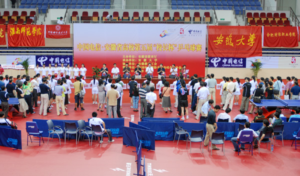 6月25日下午,由省教育厅主办、我校承办的中国电信·安徽省高校第五届“校长杯”乒乓球赛圆满结束预定各项赛程、在我校磬苑校区体育馆落下帷幕。