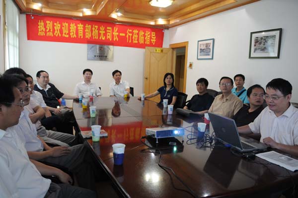 7月12日上午,教育部社科司司长杨光一行3人来我校徽学中心考察。校长黄德宽、副校长吴春梅在龙河校区徽学中心会议室会见了杨光一行。文科处、徽学中心负责同志和徽学中心研究人员等参加了会见。