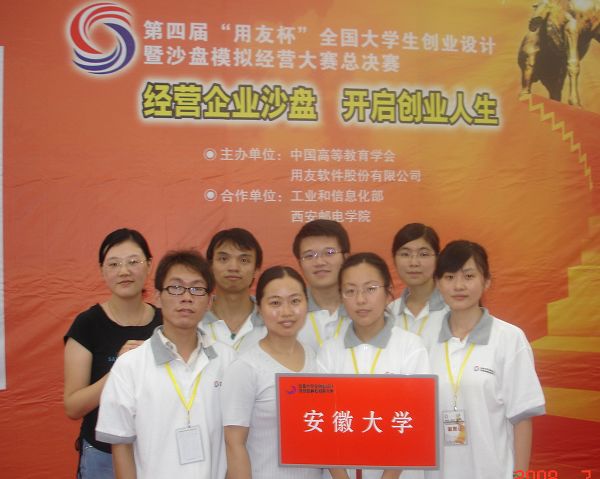 第四届“用友杯”全国大学生创业设计暨沙盘模拟经营大赛总决赛暑期在西安市曲江国际会展中心举办。由我校工商管理学院2005级卢勇(ceo)、张志恺(财务总监)、林琛(生产总监)、曾丽君(营销总监)、孟凡丽(物流总监)、刘济全(信息总监)等6位同学组成的代表队,在赵洁、张瑞老师的带领下,经过艰苦比赛,勇夺亚军,为学校赢得了荣誉。