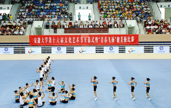 9月9日下午,新落成的磬苑体育馆洋溢着节日的喜庆。作为80周年校庆活动之一的第十六届文化艺术节暨“青春飞扬”健美操比赛在这里隆重开幕。