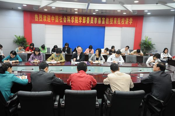10月12日,我校80周年系列学术活动之一的李崇富教授报告会在龙河校区逸夫图书馆第三报告厅举行。全国政协委员、中国社会科学院学部委员,原中国历史唯物主义学会会长、中国社会科学院世界社会主义研究中心副主任、中国社会科学院社会发展比较研究中心副主任李崇富教授应邀作了题为《构建社会主义和谐社会方法论思考》的学术报告。报告会由副校长吴春梅主持。