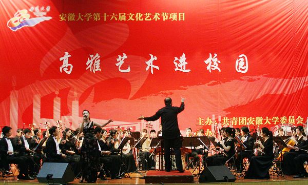 本网讯(记者 袁中锋)10月31日晚上,校庆80周年系列活动之中央民族乐团专场音乐会在磬苑校区适之楼多功能厅举行。这也是2008高雅艺术进校园的重要活动、我校第十六届文化艺术节项目之一。音乐会由著名指挥家刘沙指挥、在《春节序曲》中拉开大幕,著名艺术家单文通表演的唢呐独奏《打枣》《谁说女子不如男》使晚会气氛达到高潮。在两个小时的演出中,中央民族乐团还为我校师生演奏了《二泉映月》《一杯美酒》《牧民新歌》等中国传统曲目。晚会在《花好月圆》《拉德斯基进行曲》中圆满谢幕。