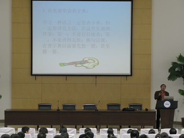 讲演中,朱跃结合大学新生的实际情况,重点阐述了大学英语与高中英语在学习内容、学习方法等方面的不同,介绍了字典的选用、单词的记忆、英语发音等学习大学英语应当注意的问题。在谈到学习英语的意义时,朱跃强调,学习英语是为了更好地进行跨文化交际、弘扬中华传统文化。