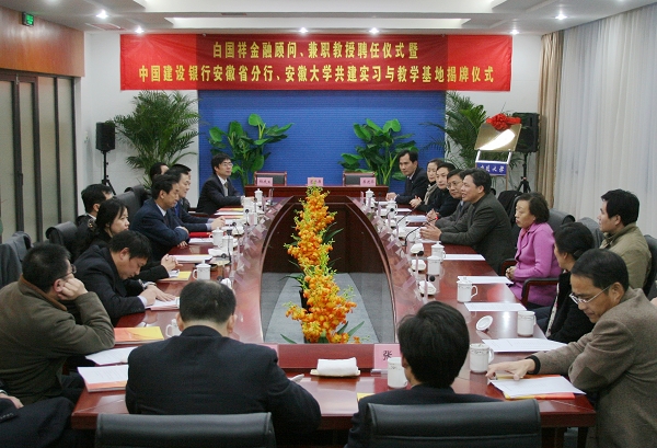 本网讯(记者鲍晓明 摄影袁中锋)12月21日下午,学校在磬苑校区办公楼b202举行仪式,聘请中国建设银行安徽省分行行长白国祥为金融顾问、兼职教授,并为与建行安徽省分行共建的教学实习基地揭牌。