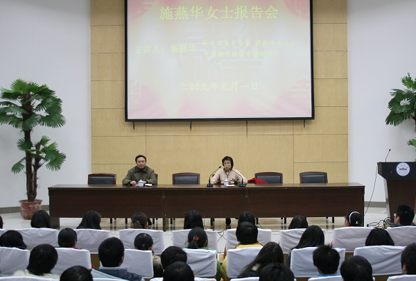 本网讯(记者袁中锋)1月1日下午,外交部英文专家、原翻译室主任、中国翻译协会常务副会长施燕华应邀来我校作报告。报告会在磬苑校区博学北楼d101举行,由副校长杜先能主持。校学生处处长顾广玲和来自各院系的500余名师生一起聆听了报告。施燕华结合自己丰富的翻译经历,就翻译工作中遇到的词语差异、信息调整、文化背景理解等应注意的事项做了精彩报告,并鼓励同学在校期间努力培养自己的政治敏感和综合能力,为做一名成功的翻译工作者奠定基础。