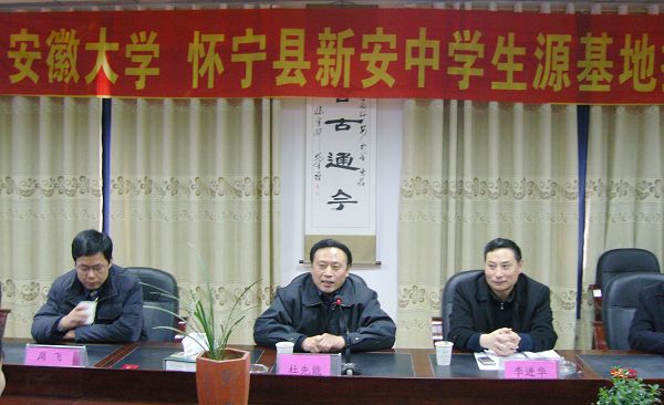 本网讯(教务处 毕 涛)2月19日,我校首个生源基地在怀宁县新安中学挂牌。副校长杜先能、教务处处长兼招办主任李进华、宣传部部长周飞、团委书记王丁凡、教务处副处长毕涛,怀宁县副县长宗秀丽、教育局局长程高明、新安中学校长王一中等出席了生源基地揭牌仪式。杜先能、宗秀丽为生源基地揭牌,李进华、王一中代表双方签定了合作协议。