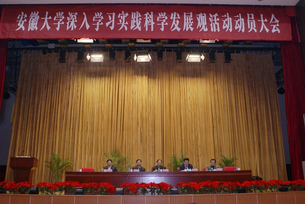 陆勤毅指出,按照省委的部署,学校研究制定并已下发了《安徽大学开展深入学习实践科学发展观活动实施方案》。我校开展学习实践活动,要认真组织广大党员特别是各级领导班子和党员领导干部深入学习实践科学发展观,要紧密联系学校发展实际和我校党员干部队伍思想和建设的实际,紧紧围绕“党员干部受教育、科学发展上水平、人民群众得实惠”的总体要求,进一步解放思想、实事求是、改革创新,切实增强贯彻落实科学发展观的自觉性和坚定性。要着力转变不适应、不符合科学发展观要求的思想观念;着力解决影响和制约学校科学发展以及党员干部党性党风党纪方面群众反映强烈的突出问题;着力构建有利于学校科学发展的体制机制,提高领导学校科学发展、和谐发展的能力,使党的工作和党的建设更加符合科学发展观的要求,把全校党员干部群众的发展积极性引导到科学发展上来,把科学发展观贯彻落实到我校高水平大学的建设上来。