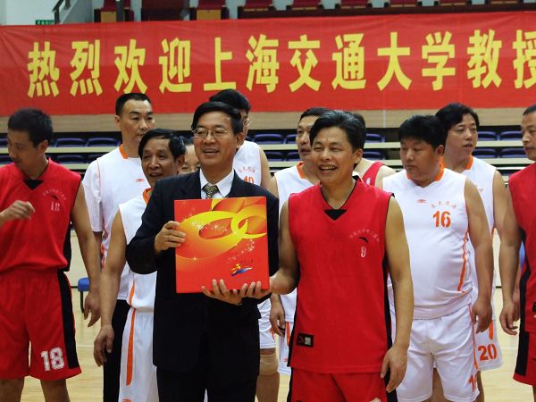 本网讯(记者朱佳佳 摄影蔡晓晓 王 松)3月21日和22日,上海交通大学教授篮球队访问我校,与我校教授篮球队在磬苑校区体育馆进行了两场友谊赛。体育馆大屏幕上显示着“以球会友,以球传情;切磋球艺,增进友谊”的醒目标语。上海交大球队以工会专职副主席倪浩为领队,我校球队以工会主席郁建民为领队。双方队员都是资历颇深的教师,平均年龄在40岁左右。比赛在紧张而融洽的气氛下进行,我校与上海交大两场球赛的比分分别为56:75和66:70。访问期间,上海交通大学教授篮球队队员们参观了文典阁校史馆。