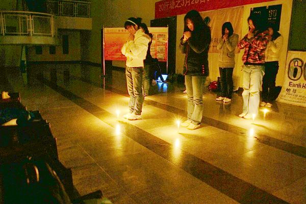 本网讯(记者朱佳佳 摄影王 松)3月28日晚,“地球一小时”关灯活动在磬苑校区适之楼多功能厅启动。随着电闸被拉下,现场观众点燃蜡烛,6名环境保护协会的同学在烛光中表演了手语节目《感恩的心》。20:29分,桃园一号楼单号宿舍进行熄灯倒计时。许多同学在鸣磬广场驻足观看。在大家的欢呼声中,参与活动的宿舍集体熄灯一小时。此次活动由我校环境保护协会主办,旨在提高大学生环保意识、关注能源气候变化问题,呼吁社会各界共同参与节能减排活动、减缓全球气候变暖。