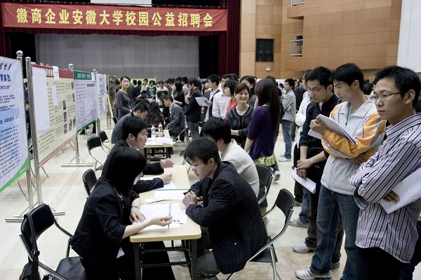 董碧参加的正是4月12日在磬苑校区适之楼多功能厅举行的徽商企业安徽大学校园公益招聘会。这场招聘由校教育基金会、省企业家联合会和安徽国际徽商交流协会主办,徽商海洋之家俱乐部、实践家教育集团合肥分公司和校学生处承办。这是我校新学期组织的第二场大型校园招聘会,吸引了安徽中环投资集团公司等37家省内企业前来参加,提供招聘岗位540个,覆盖了营销、管理、网络、汉语言文学、电气自动化等多个专业。