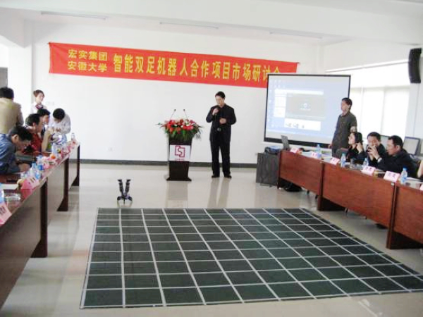 本网讯(科技处 窦 剑)4月26日下午,我校与安徽宏实企业集团在包河工业区宏实集团会议室联合举办智能双足机器人合作项目市场研讨会。与会专家从各自视角对文化机器人的发展、市场定位及项目合作机制展开了深入讨论。