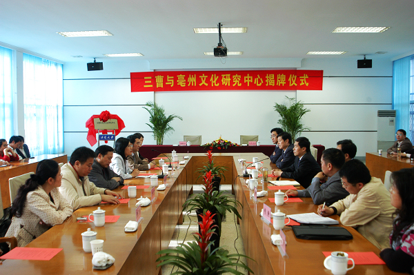 本网讯(记者 冯华周)4月27日下午,我校与亳州市人民政府共建的三曹与亳州文化研究中心在龙河校区行政楼会议厅揭牌成立。副校长杜先能与亳州市副市长胡超荣代表双方签署共建协议,副校长吴春梅与中共亳州市委常委、市委秘书长兼宣传部长张杰为研究中心揭牌。