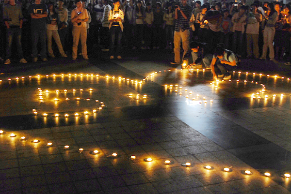 本网讯(记者朱佳佳 摄影刘志鹏)5月12日晚9点半,在《手牵手》《让世界充满爱》的歌声中,磬苑校区鸣磬广场用蜡烛摆起了“5.12”的字样;松园二号楼双号宿舍、梅园三号楼双号宿舍用灯光组成了“512”的数字与心型图案。同学们齐聚在广场,为一年前在灾难中丧生的同胞哀悼、为汶川祈福。