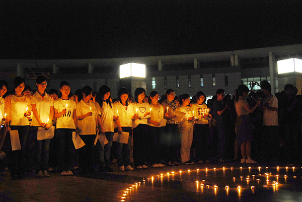 此次纪念“5.12”汶川地震一周年烛光活动,由校团委、学生会、社团管委会、爱华社共同主办。作为活动组织人之一,校学生会调研部部长王陈琛在接受记者采访时说:“我们的力量很单薄,但我希望能让远在四川的同胞感到不孤单,我们的心永远在一起。”
