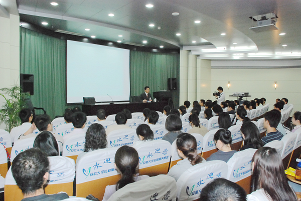 会见前,赵守博在龙河校区逸夫图书馆第二报告厅为我校法学院、管理学院研究生做了题为《全球化与劳资关系暨人力资源问题》的学术报告,介绍了三次全球化的进程和特征,并就经济全球化对劳动市场和劳资关系的影响做出分析、就全球化背景下两岸经济发展进行了全方位比较。报告人对两岸青年寄予厚望,希望大家为社会发展做出积极的贡献。校国际交流与合作处处长、台办主任徐鸣主持了报告会。
