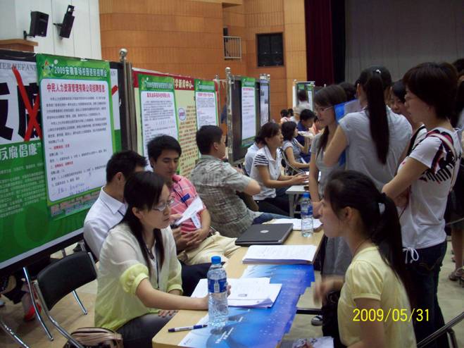 本网讯(管理学院)5月31日上午,创新人才2009安徽省首场校园巡回招聘会在我校磬苑校区适之楼多功能厅举行。50多家用人单位前来招聘,约800名毕业生参加。本场招聘会由合肥创新人才市场和我校就业指导中心主办,管理学院承办,目的是在今年严峻的就业形势下,通过创新人才市场这一平台为毕业生提供更多就业机会。