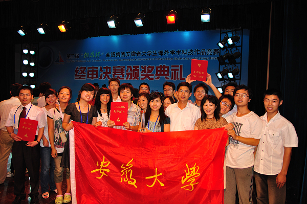 这些为我校赢得荣誉的获奖作品分别是:荣获特等奖的《高校参与非物质文化遗产保护工作的实践与思考—基于安徽省高校参与“非遗”保护工作的实证研究》(06级行政管理专业罗浩、田蕊、伍夏廷、翟婧宇、朱倩)、《徽州文化生态保护实验区建设的对策研究》(07级历史系研究生方番、吴晓星、马丽娜、陈蕊)、《城市公交路线智能查询系统》(05级通信工程宋康、徐勇、吴奎、陈琛、梅小青),荣获一等奖的《农村土地利用机制创新研究—基于皖北夏刘寨村的调查》(06级信息管理与信息系统专业吴 峰、李中阳、李婉、许威、唐小洁)、《关于粮食安全的调查与思考—来自安徽农村的报告》(06级法学专业庆启宸、宋加堂、王丹、石克链、张筱玮)、《酸介质中gemini表面活性剂对碳钢的吸附缓蚀性能》(05级材料化学专业陈浩、胡悦、毛东琳)。它们将参加今年10月份在北京航空航天大学举行的第十一届“挑战杯”全国大学生课外学术科技作品竞赛。