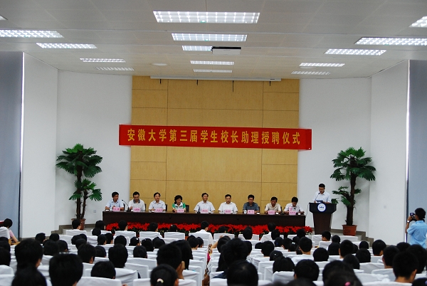 本网讯(记者毛亚美 摄影刘志鹏)6月12日下午,学校在磬苑校区博学北楼d101举行授聘仪式,法学院07级研究生杨适应、电子科学与技术学院07级研究生沈琛、管理学院06级本科生田蕊、中文系06级本科生魏健、工商管理学院06级本科生汪君等5名同学从校长黄德宽手中接过聘书,成为第三届学生校长助理。