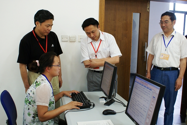 最后黄校长来到语文中心组,仔细询问今年试题的难易程度和学生的成绩情况等,并听取专家建议。黄校长高度评价了中心组的工作,他说,中心组工作是确保评阅质量,控制阅卷进度、节奏的关键,责任重大。中心组同志一定要确保评卷的准确性,维护好高考高招工作的公平公正,并为明年的阅卷工作积累宝贵经验,提供有益参考。