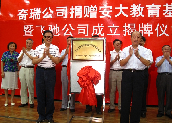 卢荣景、吴昌期为芜湖飞驰汽车零部件技术有限公司成立揭牌。孙献忠分别与张屏、袁涛签订了奇瑞公司向安徽大学教育基金会捐赠协议和安大教育基金会与芜湖奇瑞科技有限公司合资协议。签字仪式结束后,尹同跃、黄德宽、李猛等在仪式上致辞,卢荣景、吴昌期等作了重要指示。