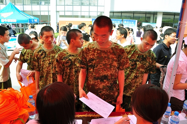 在新生报到的队伍中有一抹亮丽的绿色。09级的国防生们身着迷彩服,手里提着学校配发的橘黄色材料袋,列着整齐的队伍,到各自院系的报到处办理手续。09级新闻传播类的袁雪婷同学说,国防生是提前入学的,已进行了一周的军训,现在已差不多适应了学校环境。