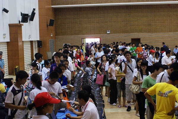 新生报到现场热闹非凡而又秩序井然。各个院系的报到处前,新生和家长们在工作人员指导下排着队办理手续。提供注册服务的联合报到处聚集的人最多,但也排着长长的队伍,但丝毫没有出现拥挤的现象。校保卫处的安全助理们一直在现场维持秩序。