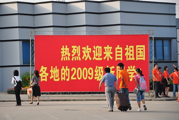 本网讯(记者曾倩文 摄影王松)“潜岳苍苍,江淮汤汤……”,9月3日上午7点,校歌就早早地在磬苑校区上空回响,全校各个院系的新生报到处已在鸣磬广场西侧至北侧依次摆出,红色、黄色的欢迎条幅迎着朝阳分外鲜艳。记者在西门看到,门口树立着“热烈欢迎来自祖国各地的2009级新同学”的欢迎标牌,“磬声悠扬喜迎八方学子 苑有书香诚育九州英才”的巨幅标语和穿梭其中的志愿者们都在热情地欢迎着2009级新同学和他们的家长。
