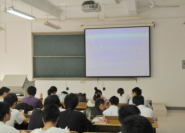 博学北楼b309教室的多媒体屏幕上,投影出一行大字格外显眼:“祝老师节日快乐”。当07自动化的阎庆老师走进教室时,她笑了。同学们齐刷刷地站起来:“老师节日快乐!”这样的祝福,让阎老师既高兴又意外。