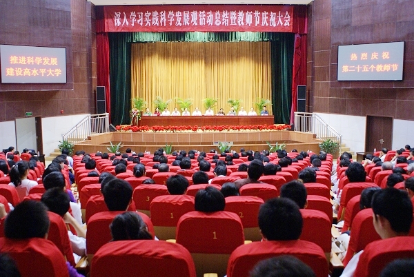 本网讯(记者童晓玲 鲍晓明 摄影王松)9月9日下午,磬苑校区小剧场内花团锦簇、喜气洋洋,我校第二十五个教师节庆祝大会在此隆重举行。校领导黄德宽、杜先能、王源扩、李仁群、王群京、吴春梅、牛立文、许继荣、胡小松、杨家芹,李世雄奖教金理事会理事长韦穗出席会议,校处级以上干部、09年新进教师、部分师生代表参加了大会。大会由李仁群主持。