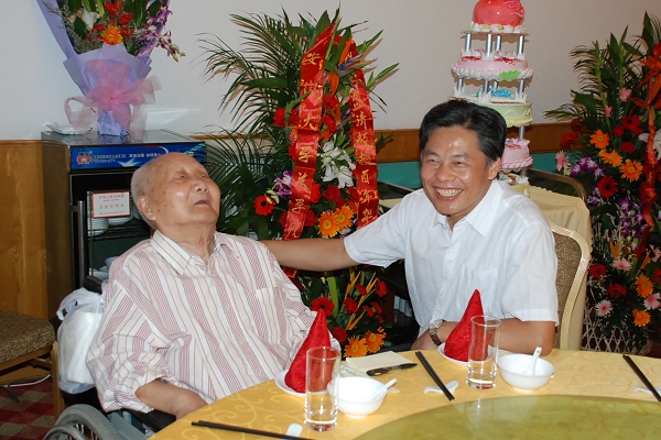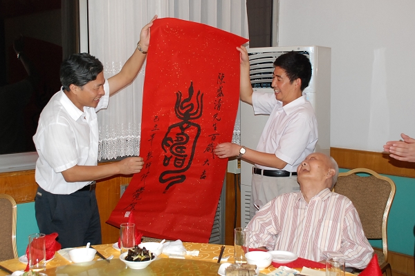 本网讯(记者蔡小晓 摄影冯华周)“今天是第25个教师节,在这个特殊的日子,我们在此庆祝陈老百岁诞辰,愿陈老健康长寿!也对在座所有老师表示节日的问候!”校党委书记、校长黄德宽向陈盛清教授深鞠一躬,以感谢他多年来对我校所做的贡献,并将自己亲手书写的“寿”字赠送给陈老,现场响起了一片热烈的掌声。