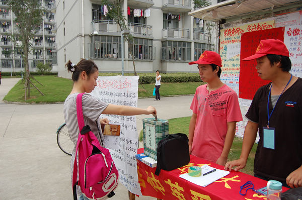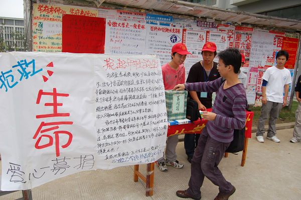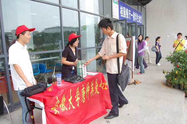 唐仲英爱心社成员和07自动化专业的学生一起组织了这次募捐活动。捐助的第二天,同学们在博学南楼前又增设了一个捐赠点。