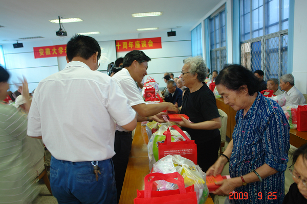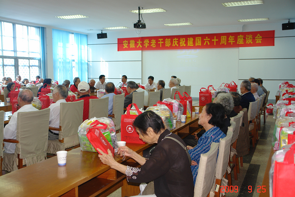 9月25日,老干部庆祝建国60周年座谈会在龙河校区行政楼会议厅隆重召开。学校领导和80多位老干部欢聚一堂。校党委书记、校长黄德宽教授在为老同志一一颁发慰问信、纪念章、慰问金的同时,还即兴赋诗一首祝贺老同志:“革命人生话从容,一洒热血建伟功,而今秋阳无限好,丹桂满园香正浓”。
