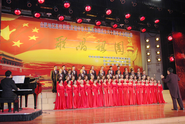 本网讯(钟 兵)9月27日下午,省委教育工委、省教育厅和省教育工会在中国科学技术大学礼堂联合举办“歌唱祖国”大合唱比赛,庆祝中华人民共和国成立60周年。我校合唱队以98.84的高分脱颖而出,荣获一等奖。省委常委、省总工会主席王秀芳,省委教育工委副书记高开华,我校党委副书记李仁群等高校领导出席并观看了演出。合肥地区16所高校及附院的教职工合唱队参加了比赛。