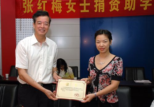 2006年时任省教育厅副厅长的虞志方向张红梅女士颁发捐资证书