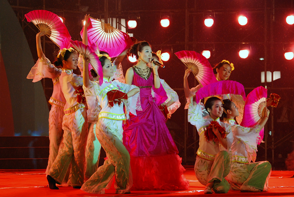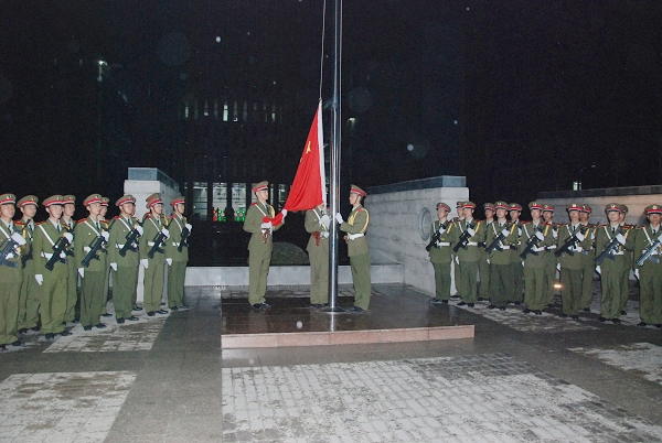 本网讯(记者杨淳 邱杨 摄影 孙春晓)“升旗仪式现在开始!”细雨中,国歌奏响,国旗缓缓升起,四柱烟火冲上了天空,一瞬间照亮了夜幕,欢呼声中,我校纪念新中国成立60周年暨2009迎新生文艺晚会于10月12日晚在磬苑校区鸣磬广场拉开序幕。