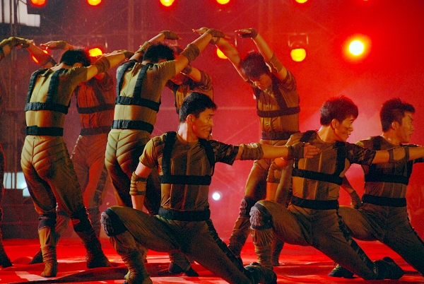 晚会以“在灿烂的阳光下”为题,分为《日出东方》、《春华秋实》和《放飞梦想》三个篇章。尽管天公不作美,阴雨绵绵,但表演人员的热情不减,人群的期盼与激动之情不减。