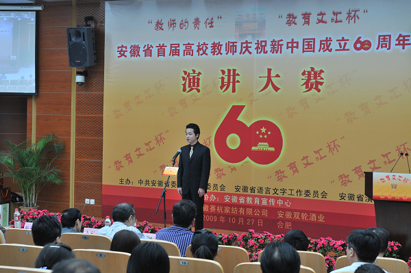 本网讯 (记者邱杨 摄影鲍晓明)10月27日上午,教育文汇杯“教师的责任”安徽省高校教师演讲比赛在我校文典阁一楼报告厅举行决赛。副校长杜先能出席演讲会。我校选送了历史系张健、艺术学院任飞2位青年老师参赛,任飞获二等奖,学校获优秀组织奖。