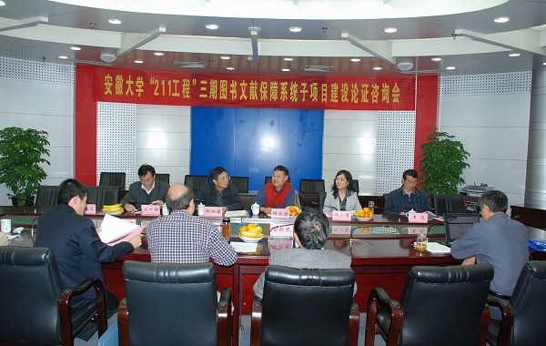 论证咨询专家组由中国科技大学图书馆副馆长田乐胜、合肥工业大学图书馆馆长柳炳康、南京大学图书馆参考咨询部主任何小清、省教育厅科技处处长汤仲胜、我校科学技术处处长俞立本、我校现代教育技术中心主任王彪组成。专家组成员审阅材料、听取汇报,针对建设方案集中研讨,提出了很多中肯、具体的意见。